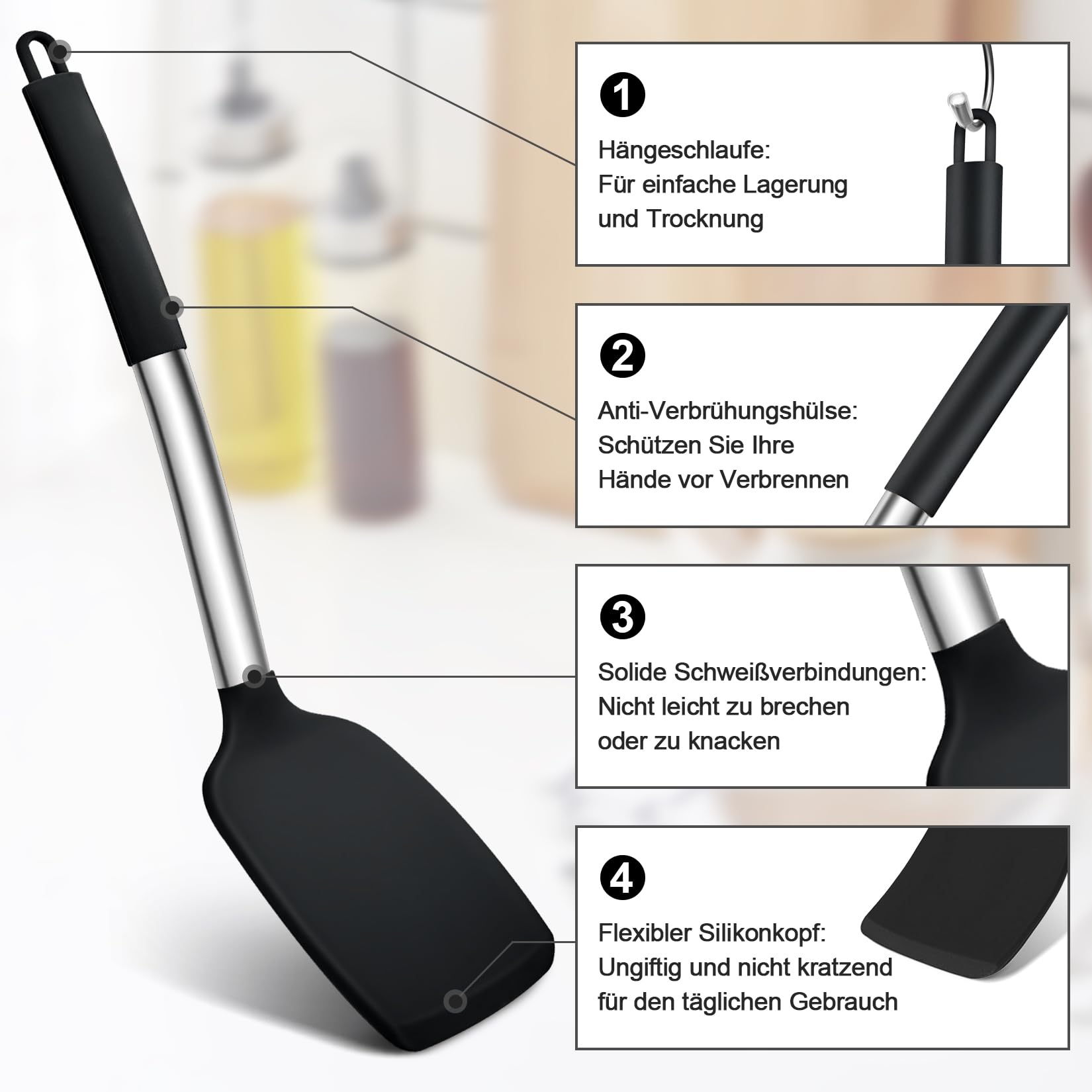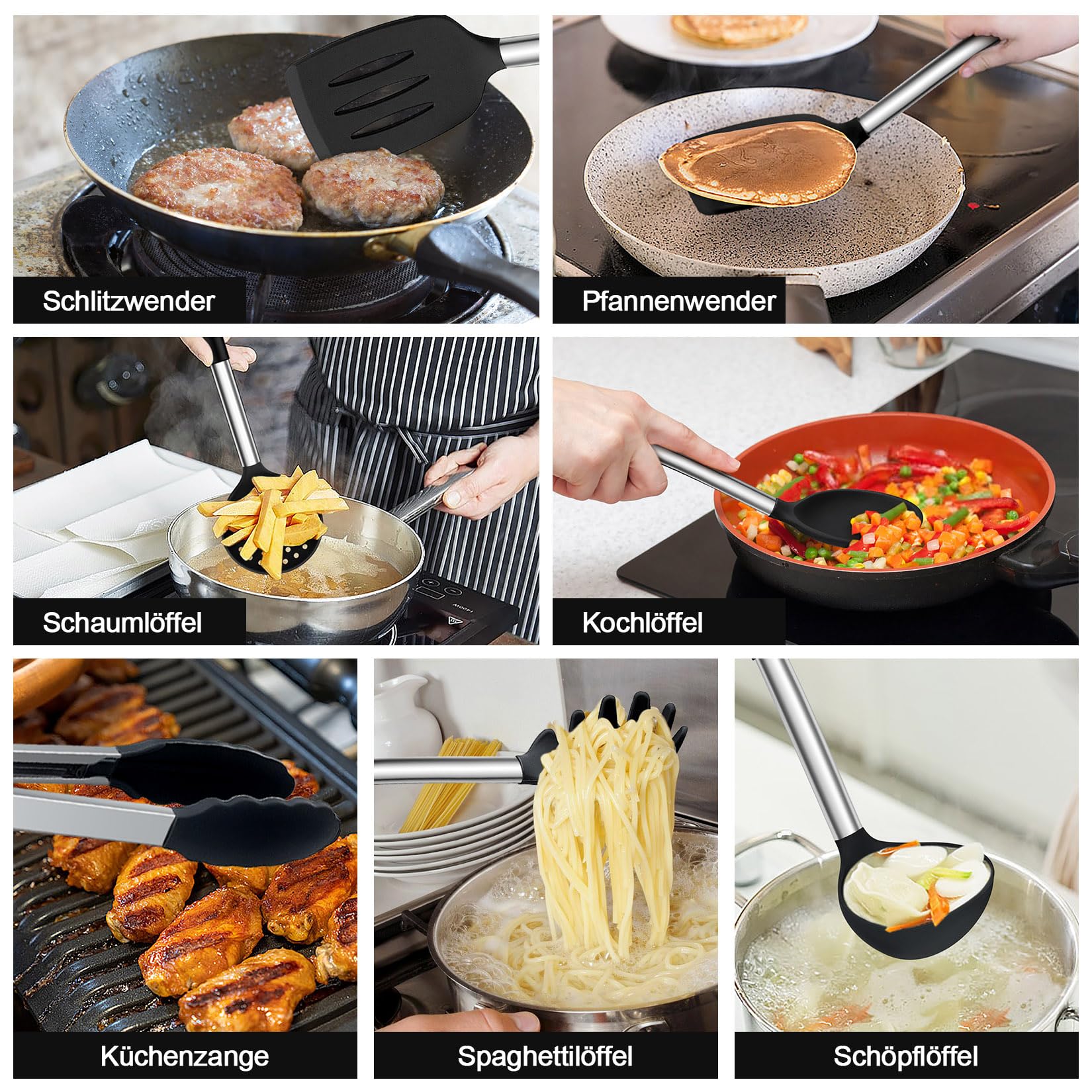 Das 7-teilige Küchenutensilien-Set aus hochwertigem Edelstahl und strapazierfähigem Silikon ist die perfekte Ergänzung für jede moderne Küche. Dank der hitzebeständigen Silikonköpfe sind die Utensilien ideal für antihaftbeschichtete Pfannen und Töpfe geeignet, da sie Oberflächen schonen und keine Kratzer hinterlassen.