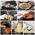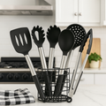Das Set umfasst alle wichtigen Werkzeuge, die du zum Kochen, Braten und Servieren benötigst: einen Pfannenwender, einen Schöpflöffel, einen Nudellöffel, einen Servierlöffel, einen Schaumlöffel, einen flachen Wender sowie eine stabile Küchenzange. Die ergonomischen Griffe mit rutschfester Beschichtung bieten einen sicheren Halt, auch bei längerer Nutzung.