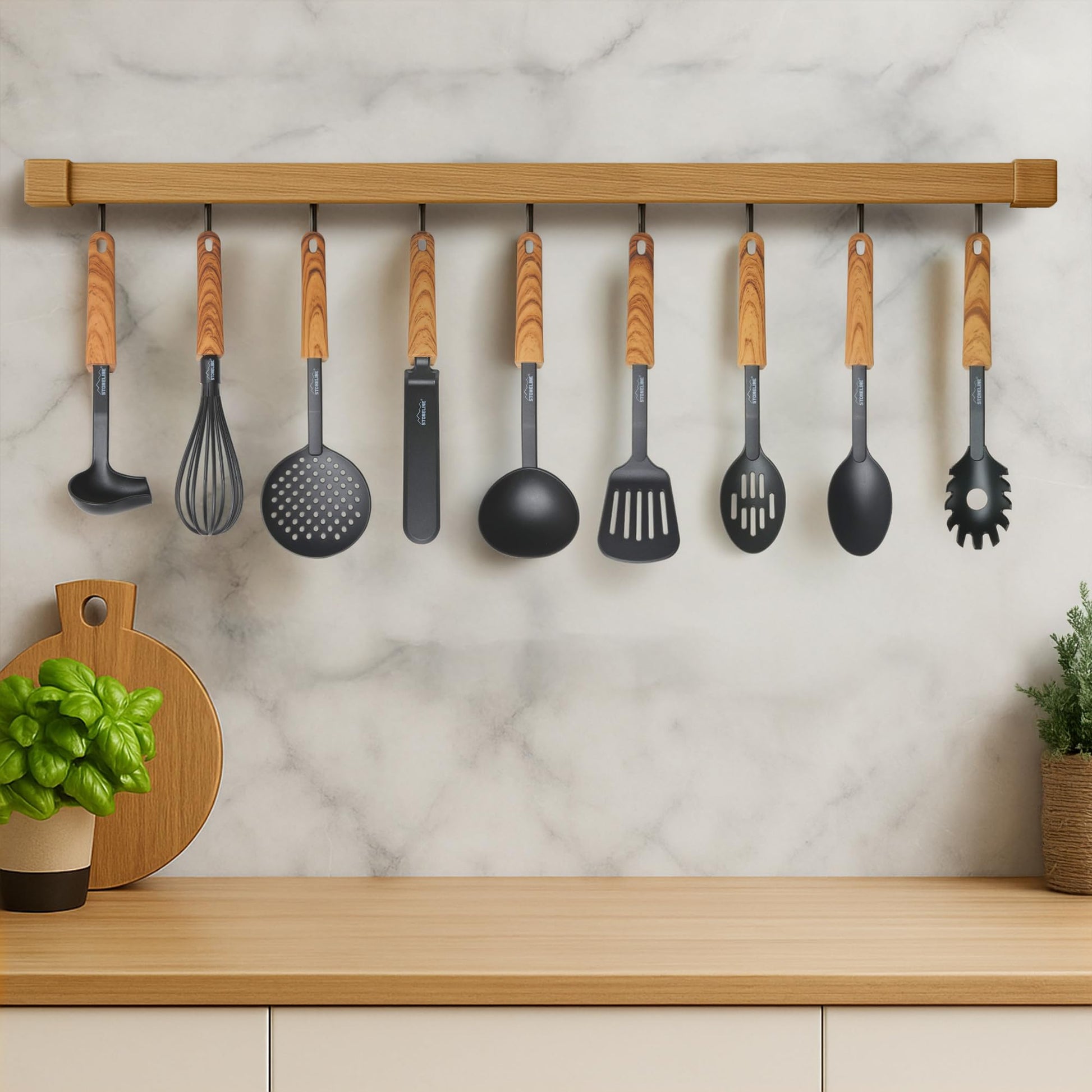 Dieses 9-teilige Küchenutensilien-Set bietet alles, was Sie zum täglichen Kochen benötigen. Die Griffe in Holzoptik liegen angenehm in der Hand und verleihen Ihrer Küche einen natürlichen Look. Die hitzebeständigen Nylon-Köpfe schützen Ihre Pfannen und Töpfe vor Kratzern und sind leicht zu reinigen.